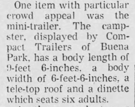 Wheels Afield magazine, February 1973Trailer Life magazine, June 1973Dinette in Compact II, Trailer Life magazine, June 1973Another picture of the dinette, mentioning “3-door locker/bunk.”
