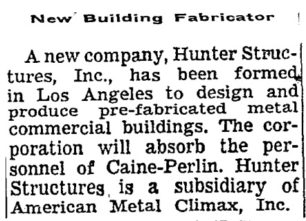 Hunter Structures, Inc. was formed in Los Angeles in 1964 to produce pre-fabricated metal commercial buildings.1 Hunter Structures, Inc. and Hunter Engineering Company were subsidiaries of American Metal Climax, Inc. (AMAX).2 Hunter Engineering Company was in the business of designing and processing equipment for the aluminum industry3 and was founded in 1935 by Joseph L. Hunter.4